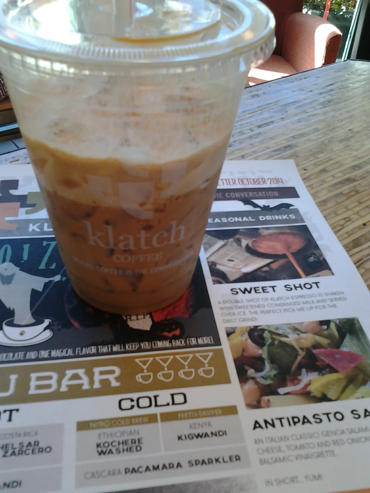 This seasonal drink craeated by Klatch is a latte using Klatch Espresso, Fresh Mint, and Black Pepper with a chocolate topping.